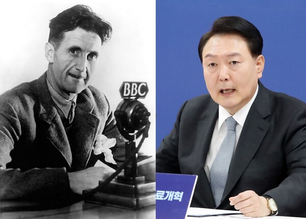 반면, 윤석열 대통령이 수시로 강조하는 자유는 오웰이 비판한 자유, 즉 표리부동의 자유, 엘리트의 자유, ‘빅 브라더’의 자유에 가깝다. 윤석열의 자유는 비교적 일관되게 반공주의, 자본주의, 시장주의를 추구한다. 그러나 이는 사람의 자유, 정신의 자유가 아닌, 자본의 자유, 권력의 자유라는 냄새를 풍긴다. 그는 이를 ‘자유민주주의’라고 아름답게 표현한다. 오웰이 언어에 대한 포장과 과장을 지극히 혐오한 반면, 윤석열은 언어에 대한 포장 기술이 매우 뛰어난 편이다. 오웰이 (거짓을 진짜처럼 믿고, 자유를 말하면서도 자유를 억압하는) ‘이중사고’를 맹렬히 비판한 반면, 윤석열은 ‘이중사고’의 달인이라 할 수 있다. 따라서 오웰이 공산주의나 사회주의 속에서 발견되는 부자유, 불평등을 가혹하리만치 비판했다고 해서 마치 그가 자본주의나 반공주의를 정당화한 것처럼 착각해선 안 된다. 오웰의 시각은 자본주의나 공산주의를 막론, 그 어떤 부자유나 불평등도 위선이라 보는 입장이었다. 요컨대, 그가 진실로 추구한 것은 그 어떤 이념에도 구애받지 않는, (사물, 생물, 사람과의) 자유롭고 친밀한 관계였다.