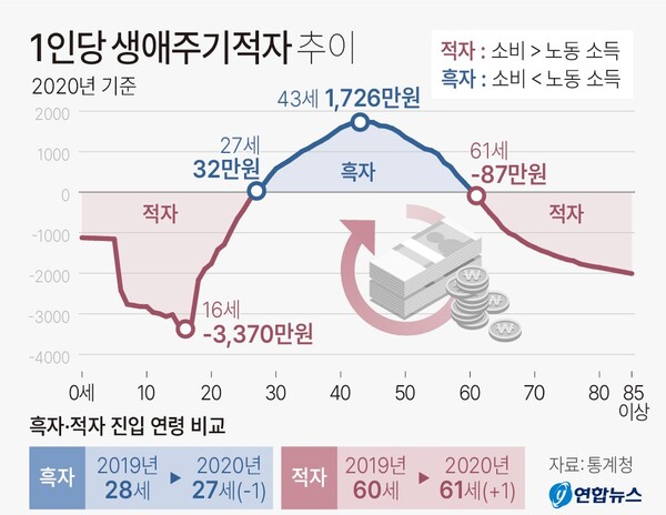 연도별로 보면 흑자 진입 연령은 27~28세로 일정한 편이나 적자 재진입 연령은 점차 뒤로 밀리는 추세다. 2010년 56세에서 2020년 61세로 5세나 밀렸다. 평균수명의 연장, 전반적인 인구 고령화 등으로 더 늦게까지 일한다는 의미다.