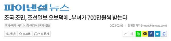 조민 씨가 세브란스 병원에 찾아가 인턴하고 싶다고 했다는 조선일보 ‘특종’은 오보로 최종 확인돼 법원의 배상금 판결이 나왔다. 한 언론은 이를 두고 ‘조선일보 오보 덕에 부녀가 700만원씩 받는다’라는 황당한 제목의 기사를 냈다. 언론의 악의적 오보임이 인정돼 법원이 배상금 지급을 판결내렸는데, 이것이 ‘오보 덕에’ 받는 돈이란 말인가? ‘오보 덕’에 돈을 받으니 조선일보에 고마워라도 해야한다는 것인가?