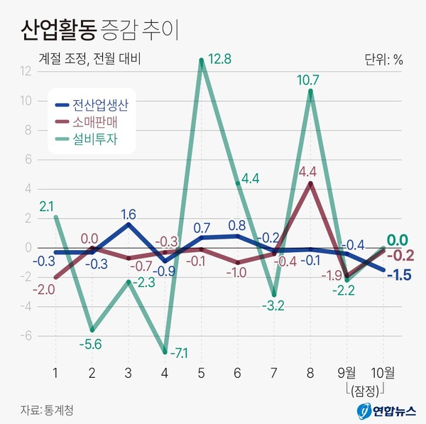 10월 산업 생산이 30개월 만에 가장 큰 폭으로 감소했다. 국내에 코로나19가 발생한 2020년 이후 30개월 만에 가장 부진한 결과다. 소비도 함께 줄면서 두 달째 감소세를 이어갔다.