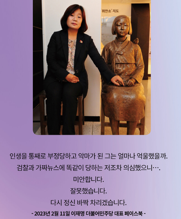 반성하고 사과하는 것은 결코 부끄러운 것이 아니며 가장 용기 있는 행동이라는 것을 보여 준 이재명 대표의 이런 태도가 민주당과 우리 사회의 더 많은 이들에게 번져가고, 윤미향 의원의 복당과 명예회복 등 실질적인 조치로 연결되길 기대한다.