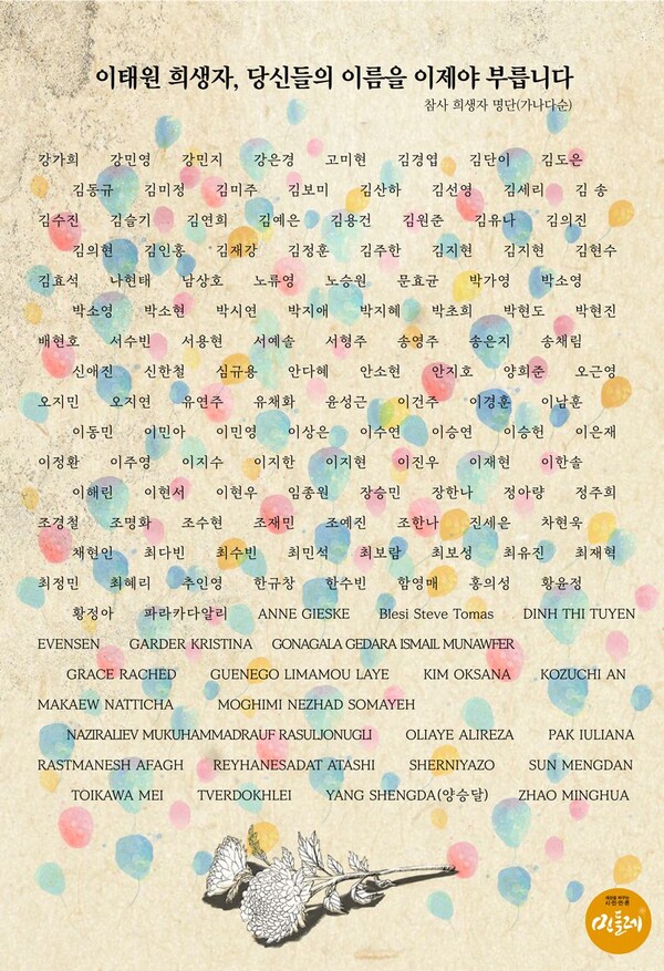 이태원 참사 1년을 맞아 유가족협의회와 시민들이 지난 2주 동안을 집중추모기간으로 정하고 분향소를 설치해 희생자들을 추모했다. 29일에는 서울시청 앞에서 추모행사를 열고 유가족들은 터져 나오는 눈물을 힘겹게 참으며 희생자들을 기억하겠노라는 편지를 읽었다. 참사의 진상규명과 책임자 처벌을 요구한 뒤 희생자들의 이름을 하나씩 불렀다. 모두가 그 이름을 기억해달라는 뜻이었다.