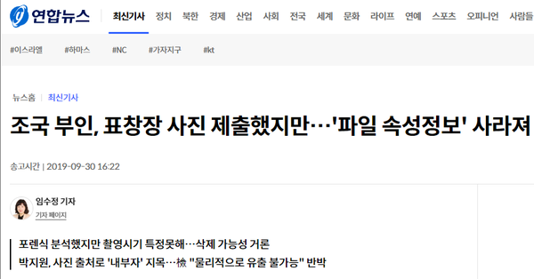 9월 30일 검찰 발로 일제히 쏟아져 나온 이 ‘속성정보’ 관련의 검찰발 ‘언플’ 기사들 중에서도 가장 가소로운 것은 중앙일보의 기사다. ☞ 조국 부인이 제출한 표창장 사진서 없어진 ‘파일 속성정보’
