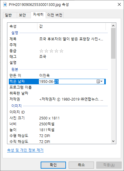 하지만 그런 경우조차도 전혀 현실적이지 않다. 이 날짜 정보가 별도의 도구 없이도 윈도우 자체 내에서 임의로 편집 가능한 것이기 때문이다. 아래에서 보다시피, 앞서의 ‘박지원 표창장’ 사진의 속성정보 중 ‘찍은 날짜’를 ‘1950년 6월 25일’ 임의로 수정하는 것은 별도의 프로그램도 없이 매우 간단히 할 수 있는 일이다.