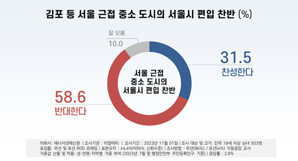 국민 다수가 반대한다는 여론조사도 나왔다. 리얼미터가 에너지경제신문 의뢰로 1일 전국 18세 이상 남녀 503명을 대상으로 조사해 2일 공개한 결과에 따르면 김포 등 서울 근접 중소 도시를 서울시로 편입하는 것에 대해 '반대한다'는 응답이 58.6%로 집계됐다. '찬성한다'는 응답은 그 절반 정도인 31.5%에 그쳤고, '잘 모르겠다'는 응답은 10.0%로 조사됐다.