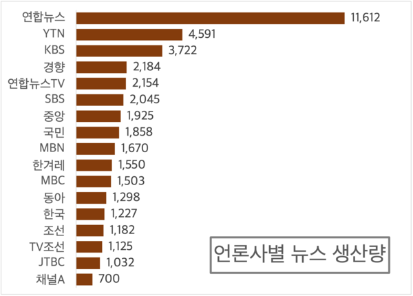 분석 결과, 연합뉴스는 이태원 참사와 관련해 무려 11,612건의 뉴스를 생산했다. 방송통신발전 기본법 제40조에 따라 재난 상황을 신속히 국민에게 전달할 의무가 있는 지상파 방송사업자(KBS, MBC, SBS), 보도전문채널 방송사업자(YTN, 연합뉴스TV), 종합편성채널 방송사업자(TV조선, JTBC, 채널A)의 뉴스 생산량과 비교하면 연합뉴스 보도량은 월등히 많다. 종이신문 계열 언론사인 경향신문, 중앙일보, 국민일보, 한겨레신문, 동아일보, 한국일보, 조선일보와 비교하면 약 5~10배 차이가 난다.