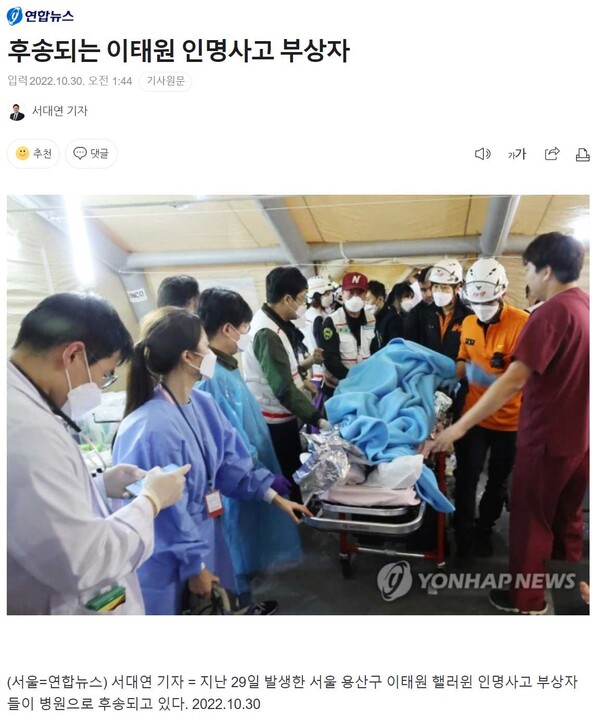 둘째, 보도에 쓰인 사진은 적절했는지도 물음표를 던질 수밖에 없다. 예컨대 10월 30일 새벽 1시 44분에 입력된 <후송되는 이태원 인명사고 부상자> 사진 보도 2건을 비교해 보자.