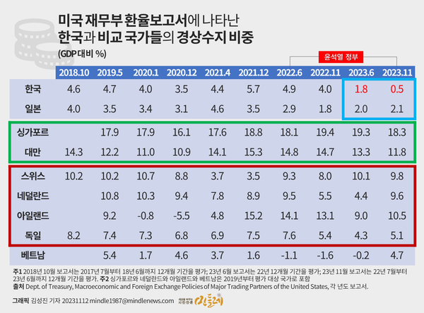 미국 재무부가 11월 7일(현지시간) 2023년 하반기 환율보고서를 발표하자 정부는 보도자료를, 그리고 정부 홍보지와 다를 바가 없는 대다수 언론은 앞다퉈 ‘(환율)관찰대상국에서 제외’라는 기사를 쏟아냈다. 그리고 중국, 독일, 말레이시아, 싱가포르, 대만, 베트남 등 관찰대상국으로 분류한 6개국을 소개하는 것도 빠뜨리지 않았다. 마치 6개국보다 우리나라가 나은(?) 국가라는 이미지를 떠올리게 한다. (그런 용어가 존재하는지 모르겠지만) ‘자학적 쾌감’이라는 말밖에 떠오르지 않는다. 아래에 자세히 언급하겠지만, 경상수지 흑자 규모가 크게 쪼그라들어 미국의 요구를 충족시킨 결과이기 때문이다.