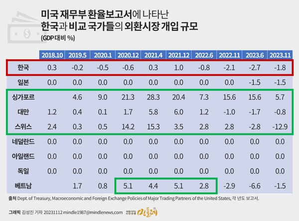 이처럼 경제주권에서 한국은 유럽의 스위스 등은 차치하고 아시아의 싱가포르나 대만 등보다 못한 국가이다. 베트남, 스위스, 대만 등은 2020년 12월, 21년 4월, 21년 12월 연속해서 미국이 제시한 3가지 기준을 위반하였다. 스위스는 22년 6월까지 연속 네 차례나 3가지 기준 모두를 위반하였다. 그런데 멀쩡하다. 오히려 미국이 갈등을 봉합하기 위해 사실상 서둘러(?) 환율조작국을 해제해 주었다. 그런데 대한민국만이 미국이 환율보고서를 발표할 때마다 모든 언론이 호들갑을 떨며 보도한다. 미국이 발표할 때마다 대상 국가 대부분이 관찰대상국으로 지정되는 현실인데 우리만 요란하다.
