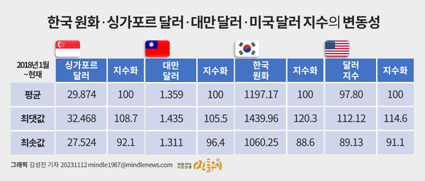 이처럼 한국과 달리 유럽은 물론이고 동아시아 국가들조차 왜 외환시장 개입을 불사하며 경상수지 흑자 달성을 추구하고 있을까? 글로벌 불균형 문제는 기본적으로 미국의 화폐주권(경제주권) 대 나머지 국가들의 화폐주권(경제주권)의 충돌이기 때문이다. 주권국가란 자국 문제를 타국의 간섭없이 독자적으로 처리할 수ㅌ 있는 국가를 의미한다. 경제문제 해결의 출발점은 화폐가치 안정이다. 미국에 통화정책의 자율성 확보가 중요하듯이 한국 등에 화폐가치 안정을 포함해 (외환위기 때 겪었듯이) 급작스러운 외국자본 유출에 따른 은행 및 외환위기에 대한 방어망 구축은 절대적 과제이다. 경상수지 확보의 차이는 한국과 대만과 싱가포르의 외환보유액 규모에서도 그 차이가 확인된다. 외환위기 이후인 1998년부터 2021년까지 한국의 외환보유액은 GDP 대비 평균 23.7% 정도였으나, 대만과 싱가포르는 각각 71.1%와 86.9%로 한국보다 3~4배 높은 수준을 유지하고 있다. 그 결과 화폐가치의 안정성에서도 큰 차이가 확인된다. 다음 표에서 보듯이 2018년 이후 최근까지 한국 원화, 싱가포르 달러, 대만 달러, 달러지수의 변동성을 보면 한국 원화가 가장 큰 것으로 나타났다. 대만 달러와 싱가포르 달러는 달러지수보다 변동성이 적었다.