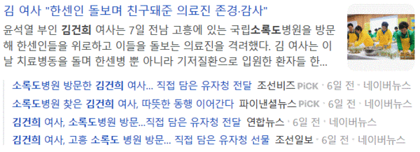 한 기사에서는 ‘소록도 천사’가 보인다. 또다른 기사에서는 ‘김건희 특검법'의 원인 제공자인 ‘범죄 가담자’가 보인다. 극과 극의 상반된 모습이다. 모순적인 두 기사의 주인공은 한 사람이다. 윤석열 대통령의 부인 김건희 씨다.