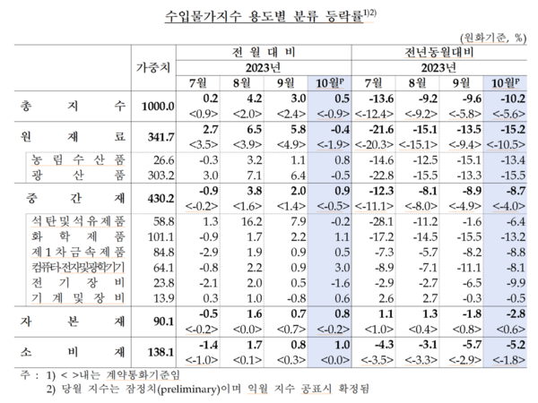 한국은행이 14일 발표한 수출입물가지수 통계에 따르면 10월 기준 수입물가지수(원화 기준 잠정치·2015년=100)는 140.38로 9월(139.67)보다 0.5% 상승했다. 전월 대비 수입물가지수는 지난 7월 상승 전환한 뒤 넉 달 연속 올랐으나, 상승 폭은 9월(3.0%)보다 축소됐다.