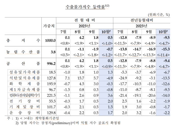 10월 기준 수출물가지수는 120.17로 9월(119.62)보다 0.5% 상승했다. 수출물가지수도 지난 7월부터 넉 달 연속 올랐지만, 상승 폭은 9월(1.8%)보다 축소됐다.