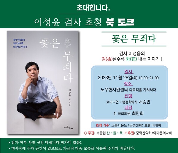 아내 이상숙 씨 역시 전문가다. 취미로 꽃 그림을 그리다 그걸 모아 책을 내기도 했으니 명실공 전문가다. 박순찬 화백이 삽화로 그린 꽃 그림도 눈에 띈다. 책은 다음주 월요일부터 온라인 서점과 오프라인 서점에 동시에 깔릴 예정이다. 이성윤 검사와 함께 하는 북토크도 준비했다. 출판사측은 한정된 좌석 때문에 사전 신청을 받아 무작위 추첨으로 시민들을 모실 계획이다. (맨아래 북토크 일정표)