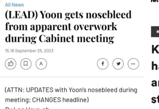 윤석열 정권 출범 이후 연합뉴스는 친정권, '친윤' 보도로 마치 지난 80년대의 관영언론으로 돌아간 듯한 모습을 보였다. 이달 8일 연합뉴스 노사편집위원회에서 다뤄진 한 건의 기사가 그 일례다. 지난 9월 25일 송고된 <Yoon gets nosebleed from apparent overwork during Cabinet meeting, 윤(대통령)이 과로로 코피를 흘렸다>는 영문 기사에 대해 노조측에서는 “영어 원어민들이 읽기에 마치 권위주의 국가 관영언론의 국가지도자 기사처럼 느껴진다는 지적이 나온다”면서 “소셜미디어에서는 문제의 기사와 노동신문의 김정은 관련 기사를 비교하는 조롱글이 화제가 되기도 했다. 국가기간통신사인지 국영통신사인지 혼동된다는 지적이다”라고 밝혔다.
