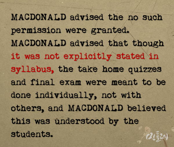 문제의 전화 진술서에 따르면 맥도널드 교수는 FBI와의 전화 인터뷰에서 ‘타인의 도움을 받지 말라는 내용을 강의계획서에 제대로 기재하지 않았다’(‘it was not explicitly stated in syllabus’)라고 진술했다.