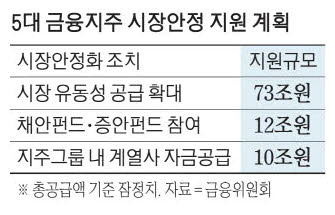 이날 금융지주사 회장들은 은행채 발행을 자제하고 한국전력 등 공기업과 소상공인·중소기업·대기업에 대한 자금 공급 확대, 특은채·여전채·회사채·기업어음(CP) 및 자산유동화기업어음(ABCP)·환매조건부채권(RP) 매입에 나서는 등 시장 유동성 공급 확대에 73조원, 채권시장안정펀드 및 증권시장안정펀드 참여에 12조원, 지주 그룹 내 계열사 자금공급에 10조원 등 총 95조원을 투입하기로 했다.