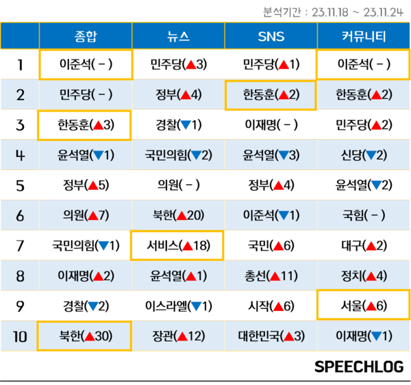 11월 넷째주 언론 뉴스와 SNS·커뮤니티·트위터·유튜브 등 디지털 플랫폼을 합친 종합 키워드 언급량 순위에서 ‘이준석’은 3주째 1위를 차지했다. ‘한동훈’ 키워드는 2주전 52단계가 뛰어 단숨에 5위에 오르더니 지난주엔 3단계 더 뛰어 3위까지 상승했다. 11월 중 최다 언급량에서 높은 순위로 급상승한 키워드는 ‘인요한’ ‘서울’(편입) ‘신당’ ‘북한’ 등이다. ‘윤석열’ 키워드는 지난주 4위, 2주전 3위, 3주전 7위를 기록했다.