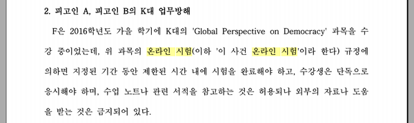 이 혐의에는 매우 보기 드문 특수성이 있다. ‘미국 소재 대학교’에서 ‘미국인 교수’가 진행한 온라인 퀴즈에서의 부정행위 여부를 한국의 법정에서 따지고 있는 것이다.