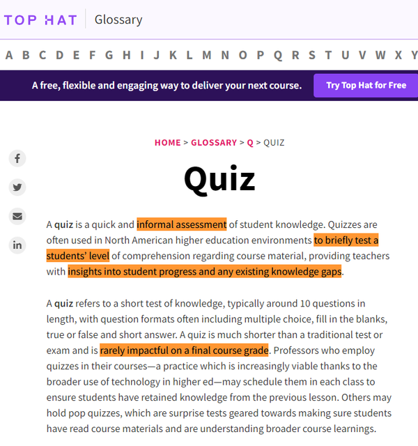 한 예로, 북미 지역 교육 분야에서 가장 유명한 캐나다 스타트업인 톱햇(TopHat’)에서 운영하고 있는 교육 용어집에서는 ‘quiz’의 의미에 대해 아래와 같이 설명하고 있다. 보다시피 ‘quiz’를 ‘비공식적 평가', ‘학생들의 레벨을 간략하게 테스트하기 위한 것’, ‘최종 성적에는 거의 반영되지 않는다’라고 설명하고 있다. ☞ TopHat - The Glossary of Higher Ed - Quiz