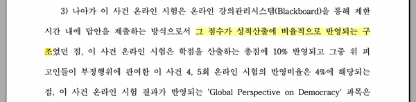(이것은 단순히 우연일까? 1심 재판부가 성실한 참여가 중요하다고 해석될 수 있는 주의사항은 본문에서 누락시키고, 근거도 출처도 없는 ‘성적산출에 비율적으로 반영’ 부분을 난데없이 등장시켰다. 원문 내용에서 형성평가로 해석되는 중요 주의사항은 본문에서 누락하고 정반대로 총괄평가로 해석되는 허구의 문구를 추가한 것이다.)