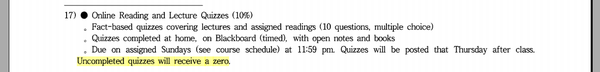 그런데 이 영문 원문의 마지막 줄의 내용에 중요한 주의사항이 있다. “Uncompleted quizzes will receive a zero”, 즉 ‘완료하지 않은 퀴즈는 0점 처리한다’는 것이다.