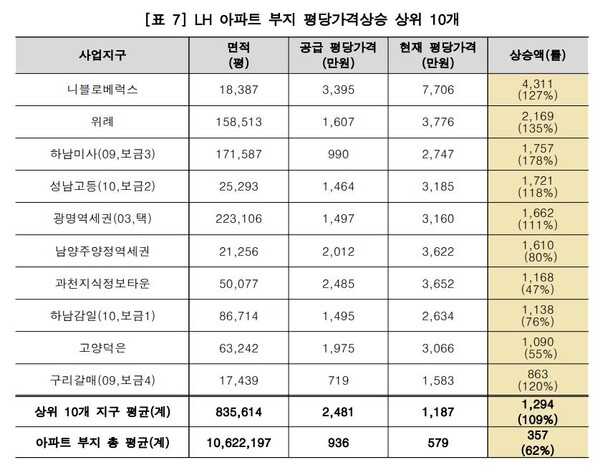 경실련이 정의당 심상정 의원실에서 제공한 LH 공공택지(공동주택 부지) 매각 현황 자료를 바탕으로 분석한 결과 2013년 1월부터 올해 8월까지 매각한 공공택지 중에 공동주택지가 40㎢(약 1220만 평)에 달했다. 여의도 면적의 14배이고 강남구보다 넓은 크기다. 평당 평균 매각 가격은 2013년 504만 원에서 2021년 1061만 원으로 크게 오른 뒤 현재 1000만 원 안팎을 유지하고 있다.