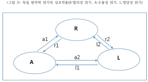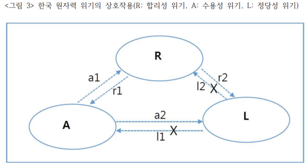 독일의 탈원전을 원자력 행정의 합리성 위기, 원자력 이용의 정당성 위기 및 수용성 위기의 상호작용의 결과로 살펴본 것처럼 한국도 이 위기 다이어그램으로 살펴볼 수 있다. 독일과 비교할 때 한국의 위기 다이어그램은 <그림 3>과 같이 나타난다. 독일의 위기 다이어그램과 달리 한국에서는 각 위기의 영향이 점선으로 나타난다. 이것은 위기의 징후는 있으 나 독일처럼 상업용 원전 이용에 대한 근원적인 문제제기로 이어지지 않았기 때문이다.