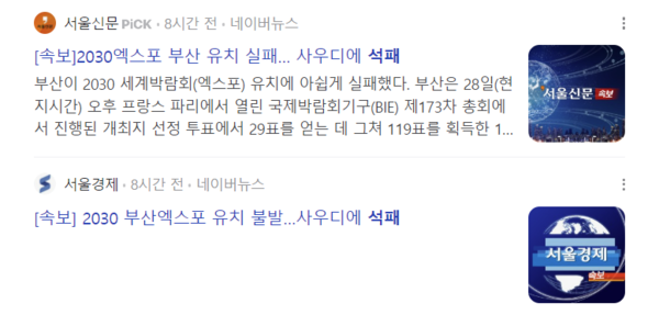 그러나 현지 투표 결과 소식이 알려지던 시각, 한국 언론들의 속보는 눈살을 찌푸리게 했다. <서울경제>는 2030 부산엑스포 유치 불발…사우디에 석패라는 제목으로 속보 기사를 내보냈고 <서울신문>도 2030엑스포 부산 유치 실패…사우디에 석패라는 제목으로 비슷한 속보를 내보냈다.