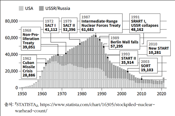 역사적으로 세계의 핵무기 수는 냉전을 거치며 양적으로 상당히 줄어들었다. 1986년 7만 300기에 달했던 것이, 2023년에는 1만 2512기로 감소했다. 이중 미국의 핵탄두는 3709기. 종종 이러한 성과를 군비 통제 협정의 결과로 치부하기도 하지만 숫자만으로 비교하는 건 겉만 보고 속을 놓치는 것이다. 오늘날 핵무기 위력은 옛날과는 비교할 수 없을 정도로 강력하다.