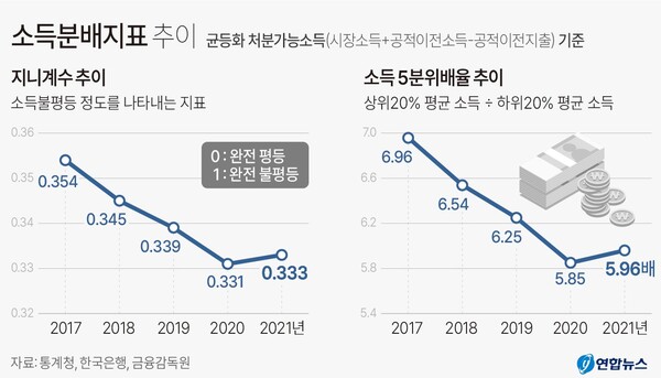지난해 상위 20% 계층(5분위)이 하위 20% 계층(1분위)보다 소득을 6배 더 벌어들인 것으로 나타났다. 코로나19 사태가 점차 진정되는 과정에서 저소득층에 대한 정부 지원금이 줄어들자 분배 지표가 악화됐다.
