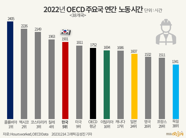 일례로 2022년 기준 한국의 연간노동 시간은 1901시간으로 경제협력개발기구(OECD) 국가 중 5위다. OECD 평균(1752시간)이나 최하위국인 독일의 연간 노동시간(1341시간)과 비교해도 한참 높은 수준이다. 52시간 근무제 도입에도 세계 최장 수준의 노동시간을 기록하는 한국 사회에 대한 사법부의 고찰이 필요해 보인다.