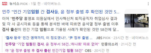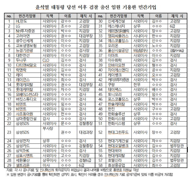 윤석열 정부 출범 이후 검사와 수사관 등 검찰 출신으로 삼성, 현대, 한화 등 민간기업 임원으로 전직한 사람은 58명에 달하는 것으로 확인됐다. 검찰 출신으로 공공기관에 임원으로 취업한 사람도 18명이었다.
