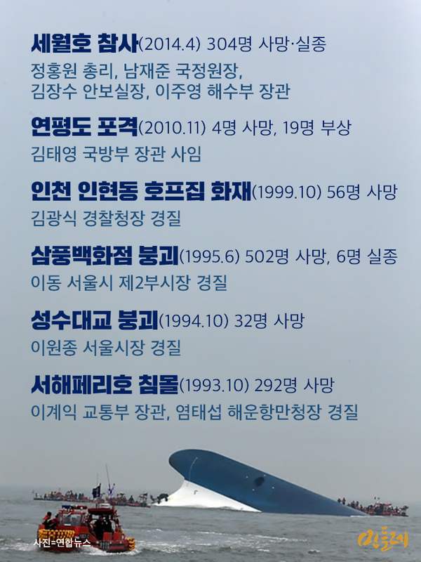 성수대교 붕괴 때는 이원종 서울시장, 삼풍백화점 붕괴 때는 서울시 제2부시장이 해임됐다. 인천 인현동 호프집 화재 때는 김광식 경찰청장이 경질됐다. 다른 사회적 참사와는 결이 다르지만 연평도 포격 사건 같은 경우에도 당시 김태영 국방부 장관이 사임했다.