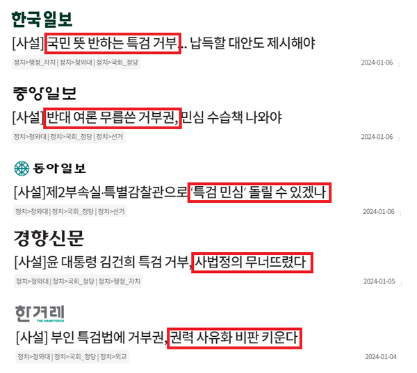 경향과 한겨레는 윤 대통령의 특검 거부에 조목조목, 그리고 단호히 비판하는 사설을 게재했다. 경향은 5일자 사설 “윤 대통령 김건희 특검 거부, 사법정의 무너뜨렸다”에서 “현직 대통령이 가족 비리 의혹에 대한 특검 수사를 막은 것은 처음”이라며 “총선과 관련 없는 시기에 제출된 법안을 여태껏 외면하고 방해했던 여권이 이제 와서 ‘총선용’ ‘국정 혼란’ 핑계대며 거부하다니 억지도 이런 억지가 없다. 주가 조작은 중대한 민생 범죄이고, 윤석열 정부 출범 후 검찰이 김 여사 소환조사 한번 없이 제대로 수사하지 않았기 때문에 도입된 게 김건희 특검법”이라고 설명했다.