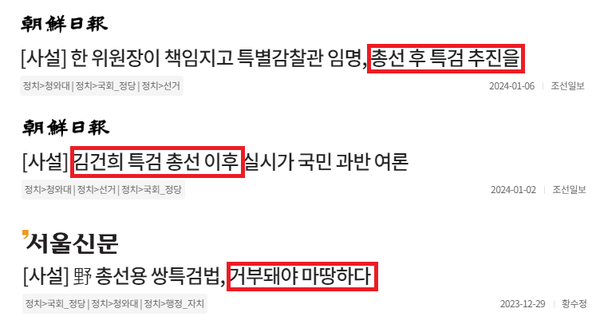여당 국민의힘과 일부 보수세력들이 폭발 직전의 ‘김건희 리스크’와 대통령 거부권 행사로 인한 지지율 하락을 막아보려고 제2부속실 설치와 특별감찰관 임명을 주장하고 있으나 한마디로 ‘무모한 짓’이라고 보는 것이다. 동아는 또 대장동특검법 관련해서도 “검찰의 50억 클럽 부실수사가 자초한 셈”이라는 제목의 사설(1월8일)을 게재했다.