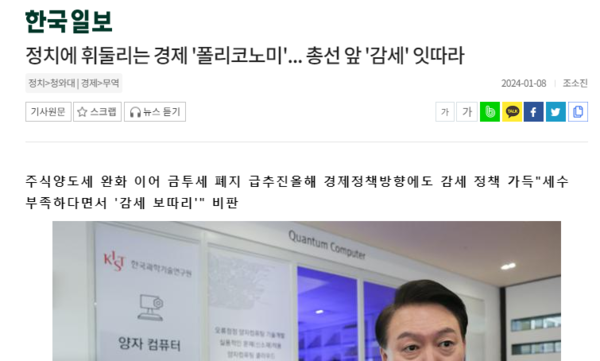 이 논설위원은 “조세와 국토관리를 볼모로 표를 구걸하는 윤석열 정부와 여당의 행태는 어떤 최상급 형용사로도 담아낼 수 없을 만큼 사악하다. ‘퍼주기’나 ‘포퓰리즘’이라는 비판으로도 부족하다”면서 이를 나라를 수십 년 전으로 후퇴시키는 ‘망국적 퍼주기’, 두고두고 상처를 남길 ‘치명적 포퓰리즘’이라고 이름붙였다.