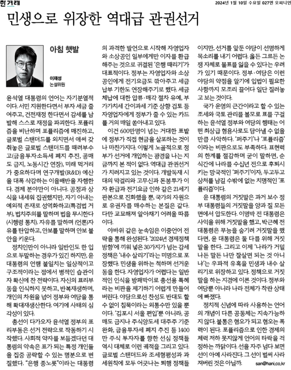 한겨레의 이 칼럼이 선거를 석달 앞둔 지금 ‘참신하다’는 생각이 드는 것이 오히려 문제일 정도다. 윤석열 정부의 ‘퍼주기’와 ‘포퓰리즘’은 이미 수개월 전부터 시작되었는데, 어떤 언론도 이를 의제화(아젠다세팅)하지 않았던 것이다. 이번에 한겨레가 논설위원 칼럼으로 다뤘지만, 한겨레조차도 이를 기사를 통해 의제화하려는 시도는 없었다.