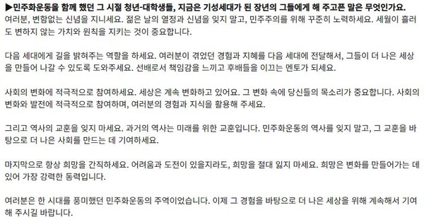 이제 노장년이 된 그들에게 ‘다음 세대에게 길을 밝혀주는 역할을 해달라, 역사의 교훈을 잊지 말아달라’는 부탁도 잊지 않았다. “여러분이 겪었던 경험과 지혜를 다음 세대에 전달해서, 그들이 더 나은 세상을 만들어 나갈 수 있도록 도와주세요. 선배로서 책임감을 느끼고 후배들을 이끄는 멘토가 되세요. 민주화운동의 역사를 잊지 말고, 그 교훈을 바탕으로 더 나은 사회를 만드는 데 기여하세요. 항상 희망을 간직하세요.”