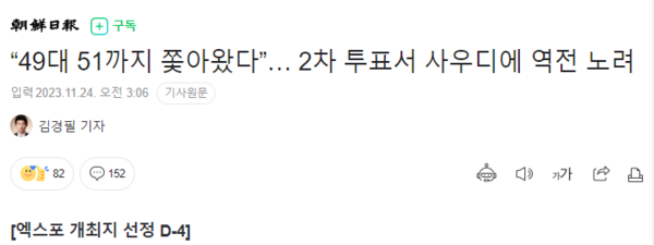 조선일보는 지난해 11월24일 엑스포 개최지 선정 4일 전에 “49대 51까지 쫓아왔다...2차 투표서 사우디에 역전 노려”라는 제목의 기사를 게재했다. 실제는 알려진 것처럼 29대 119로 완패했고, 언론 보도에서는 ‘졌잘싸’의 결과로 ‘석패’를 했다.
