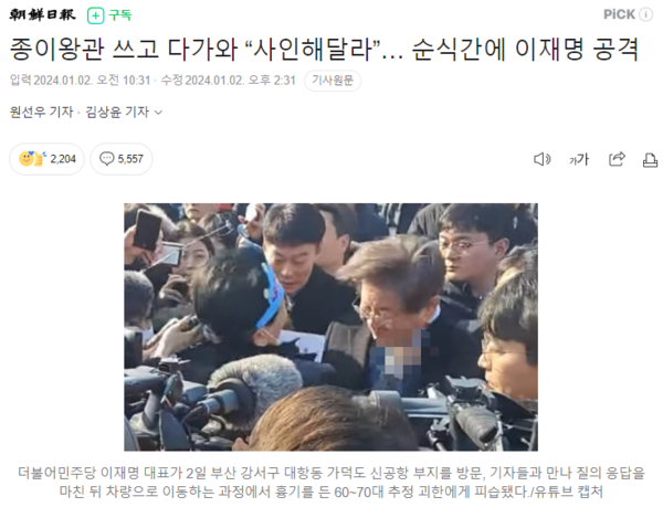 최근 조선일보는 이재명 민주당 대표 암살 시도 사건을 보도한 기사의 제목을 “종이왕관 쓰고 웃으며 다가가 순식간에 목을 푹”에서 “출혈량이 적으며, 목 부위 1cm 열상으로 경상 추정”으로 갈아탔다. 대테러 종합상황실이라는 믿음직한 취재원을 바탕으로 했으니 사실에 근거한 객관적인 보도라고 주장할 수도 있겠다.