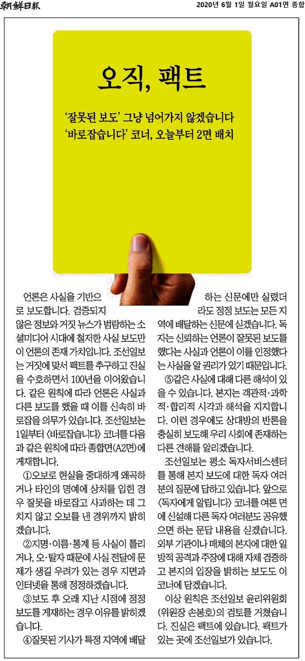 이 신문은 선언문에서 “조선일보는 거짓에 맞서 팩트를 추구하고 진실을 수호하면서 100년을 이어왔다”면서 “같은 원칙에 따라 언론은 사실과 다른 보도를 했을 때 이를 신속히 바로잡을 의무가 있다. 1일부터 ‘바로잡습니다’ 코너를 다음과 같은 원칙에 따라 종합면(A2면)에 게재한다”고 밝혔다.