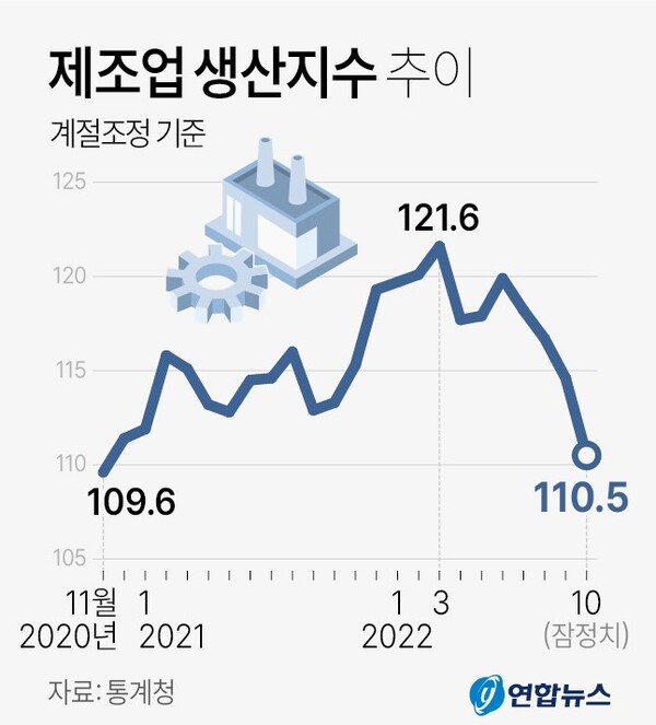4일 통계청이 발표한 산업활동동향에 따르면 지난 10월 제조업 생산지수(계절조정 기준)는 전월보다 3.6% 감소한 110.5(2015=100)였다. 이는 2020년 11월(109.6) 이후 23개월내 가장 낮은 수준이다.