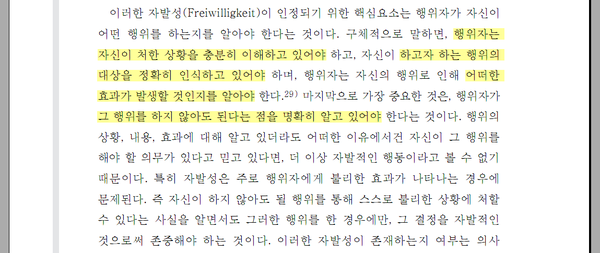 행위자 즉 임의제출자가 자신의 상황과 행위 대상을 정확히 인식하고 있어야 하며 그로 인해 어떤 효과가 발생할 것인지를 알아야 한다, 또 ‘제출하지 않아도 된다’는 점도 알고 있어야 한다고 명시되어 있다.