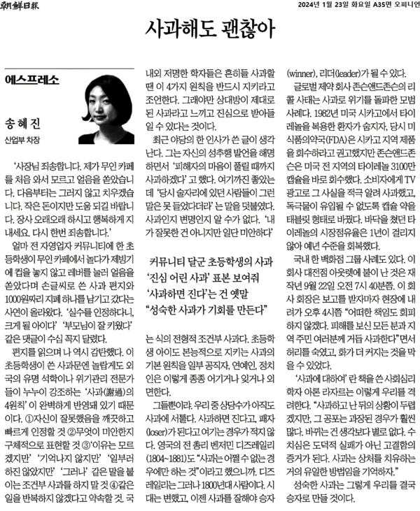 조선일보 2024년 1월23일자 35면(오피니언)에는 이 회사 송혜진 산업부 차장이 쓴 정감있는 칼럼이 실렸다. 칼럼의 제목은 ‘사과해도 괜찮아’다. 한 초등학생이 무인 카페에서 놀다가 얼음을 쏟아 손글씨로 사과편지를 썼다면서, 이 편지글을 인용하는 것으로 칼럼을 시작했다.