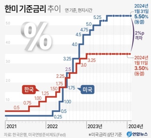 미 연준은 이날 올해 들어 첫 연방공개시장위원회(FOMC) 정례회의를 마친 뒤 보도자료를 통해 기준금리를 현재 수준으로 유지한다고 밝혔다. 이로써 미 연준의 기준금리는 5.25~5.50%를 유지하게 됐다. 연준의 기준금리 동결은 지난해 9월과 11월, 12월에 이은 4번째다. 미국과 한국(연 3.50%)의 금리 격차는 지금의 최대 2%포인트를 유지하게 됐다.