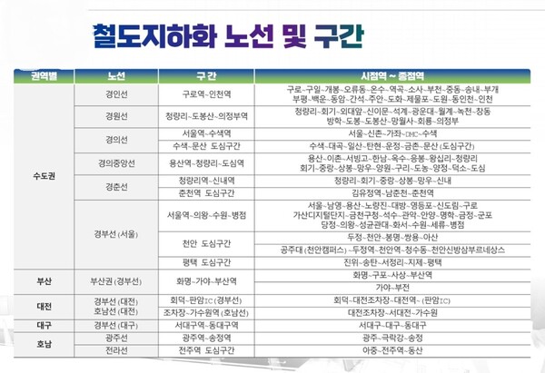 철도 지하화 대상이 되는 노선과 구간은 구로역~인천역(경인선), 청량리~도봉산~의정부역(경원선), 서울역~수색역, 수색~문산(경의선), 용산~청량리~도심역(경의중앙선), 청량리~신내, 춘천역 도심 구간(경춘선), 서울역~의왕~수원·병점, 천안 도심 구간, 평택 도심 구간, 화명~가야~부산역, 회덕~판암IC, 서대구역~동대구역(경부선), 조차장~가수원역(호남선), 광주역~송정역(광주선), 전주역 도심 구간(전라선) 등이다.