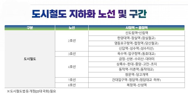 수도권 도시철도 지하화 노선 및 구간은 신도림역~잠실역, 한양대역~잠실역, 영등포구청역~합정역, 신답역~성수역(2호선), 옥수역~압구정역(3호선), 금정~산본~수리산~대야미, 상록수~한대~중앙~고잔~초지, 동작역~이촌역, 쌍문역~당고개역(4호선), 건대입구역~청담역(7호선), 복정역~산성역(8호선) 등이다.