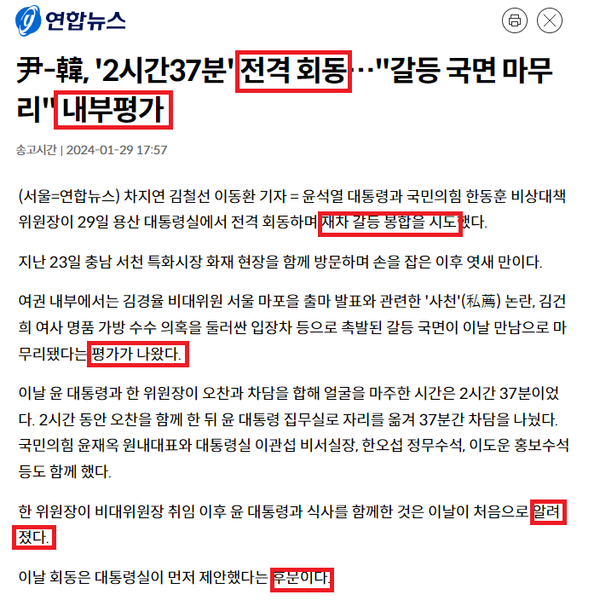 연합뉴스 보도 중엔 대통령실과 여당의 입장에 서서 쓴 기사나 칼럼이 많다. 1월 29일자 “윤-한 2시간 37분 전격회동...갈등 국면 마무리 내부평가”기사는 윤 대통령과 한동훈 비대위원장의 입장을 기사체로 옮겨놓은 보도자료에 가깝다. 기사는 두 사람의 갈등이 마무리된 것으로 보인다는 점을 부각시키고 있다. 그런데 기자가 이렇게 보는 근거는 대부분 ‘알려졌다’ ‘후문이다’ ‘평가가 나왔다’ ‘분석이 제기된다’ ‘전망도 있다’ 등 밑도 끝도 없는 것들이다. 대통령실과 여당의 입장을 옮겨놓으면서 마치 객관적인 취재원으로부터 듣고 쓴 것처럼 작성한 기사다.
