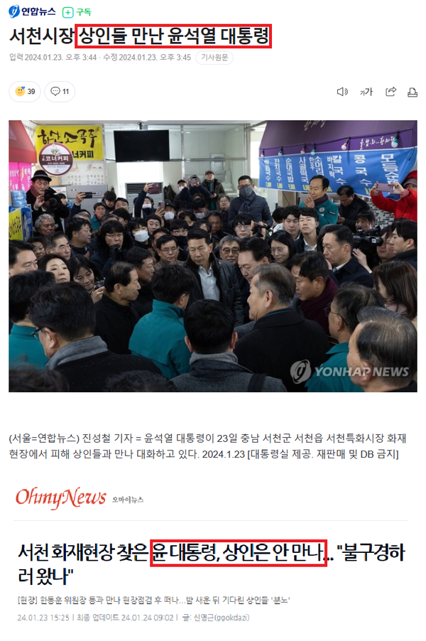 그러나 이 사진의 제목과 설명은 오보임이 밝혀졌다. 오마이뉴스는 이날 윤 대통령이 서천시장을 방문했지만 ‘피해상인들을 만나지 않았다’고 보도했다. “한동훈 단독 마중, 피해상인들 패싱...윤 대통령 35분 동안 뭘했나”제목의 기사와 “서천 화재현장 찾은 윤 대통령, 상인은 안만나...불구경하러 왔나” 기사다. 이 두 개의 기사에는 밤새워 기다렸던 대통령을 단 1초도 만나지 못한 시장상인들이 ‘분노’했다는 내용의 글과 사진이 담겨있다.